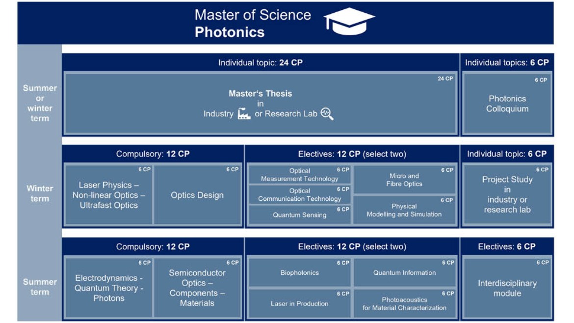 Examples of compulsory elective modules: Quantum Information; Photoacoustics; Physical Modeling and Simulation; Micro- and Fiber Optics